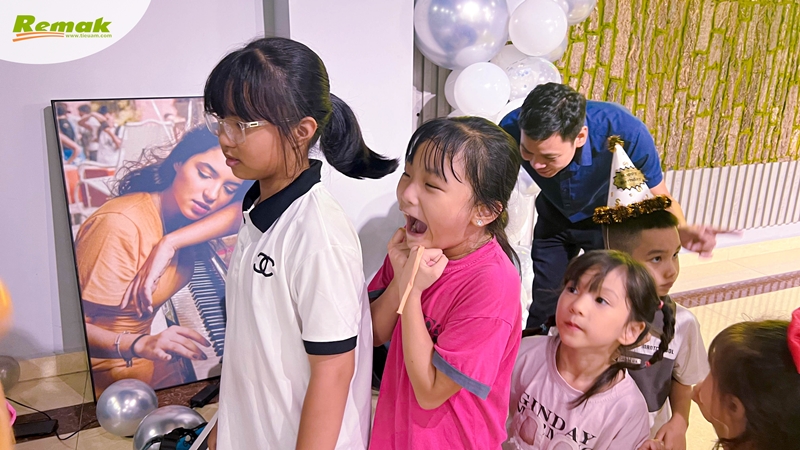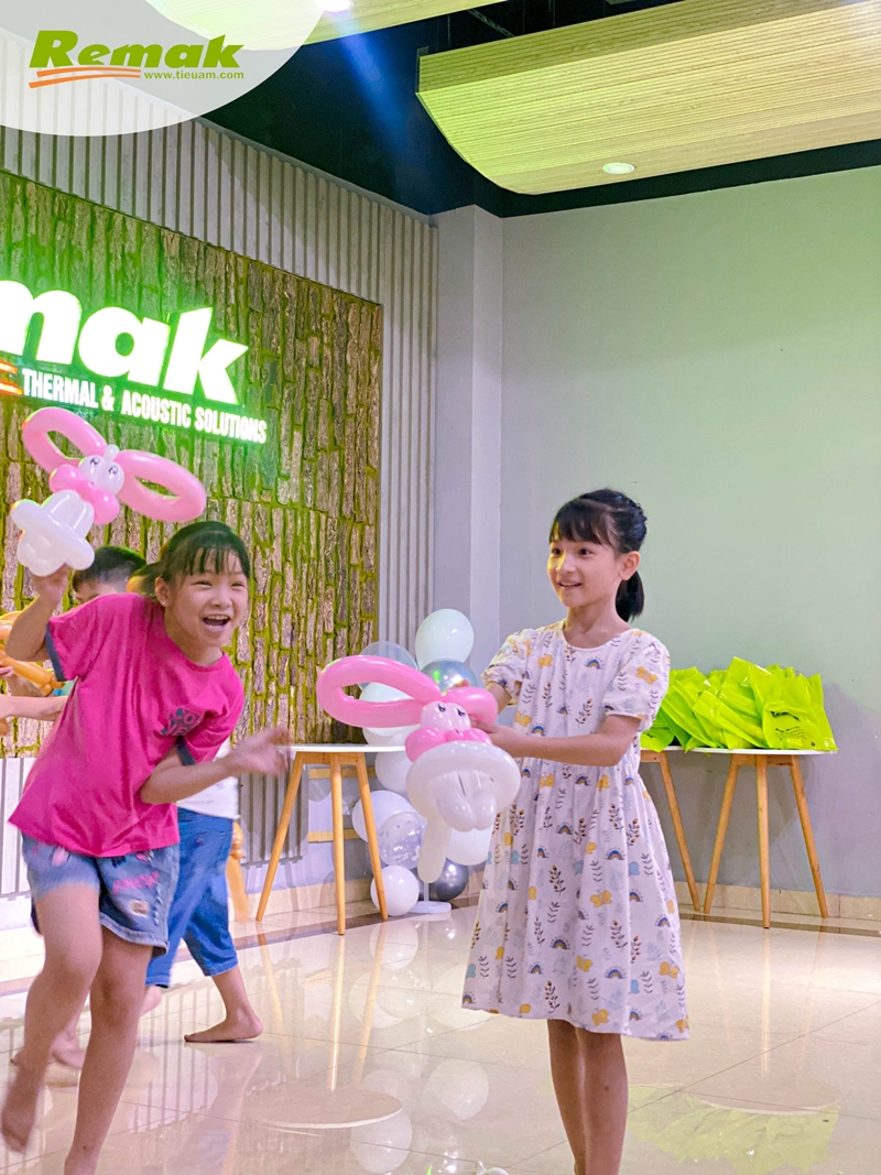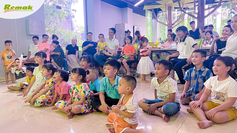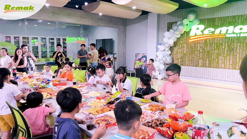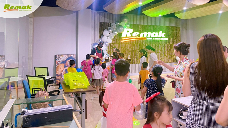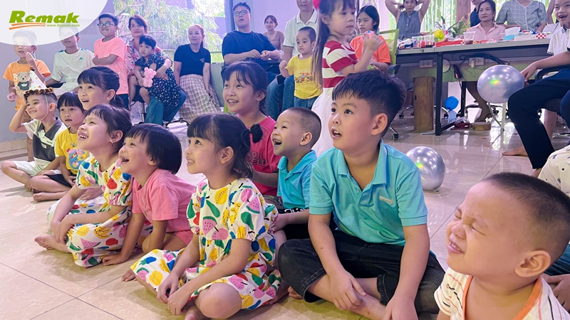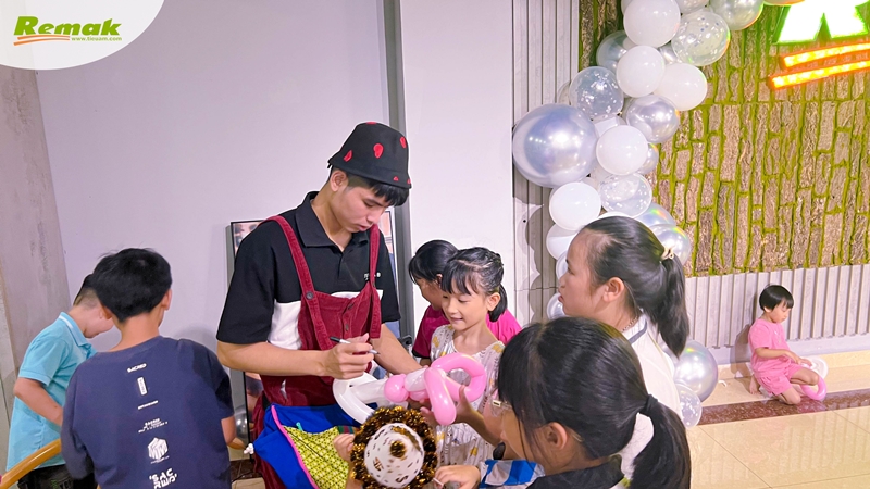 Bộ phận Sự kiện Remak đã chu đáo chuẩn bị bánh pizza, đồ ăn nhẹ, trái cây, nước ngọt… làm các con vô cùng thích thú. Trong khi đó, loạt tiết mục vặn bóng, ảo thuật, đố vui… khéo léo, sinh động, hài hước khiến cả các con lẫn ba mẹ đều say mê, hào hứng hòa mình vào từng diễn biến chương trình.