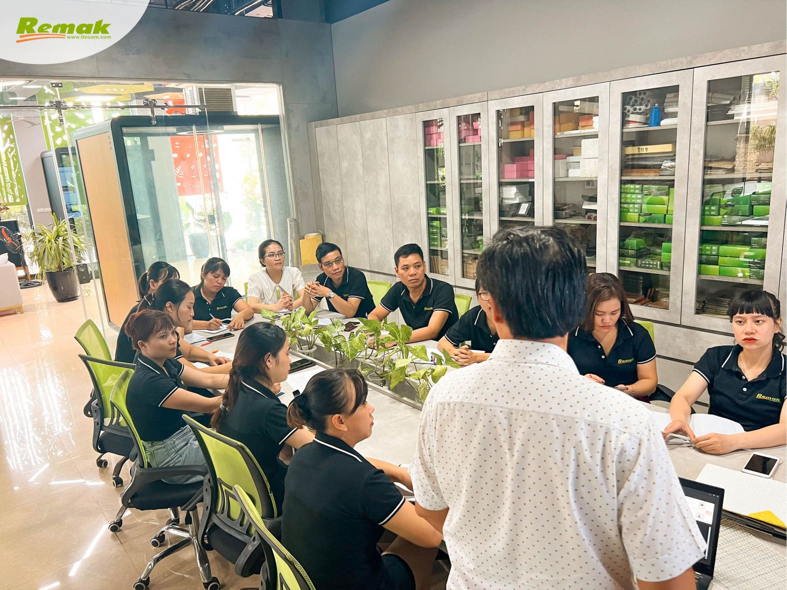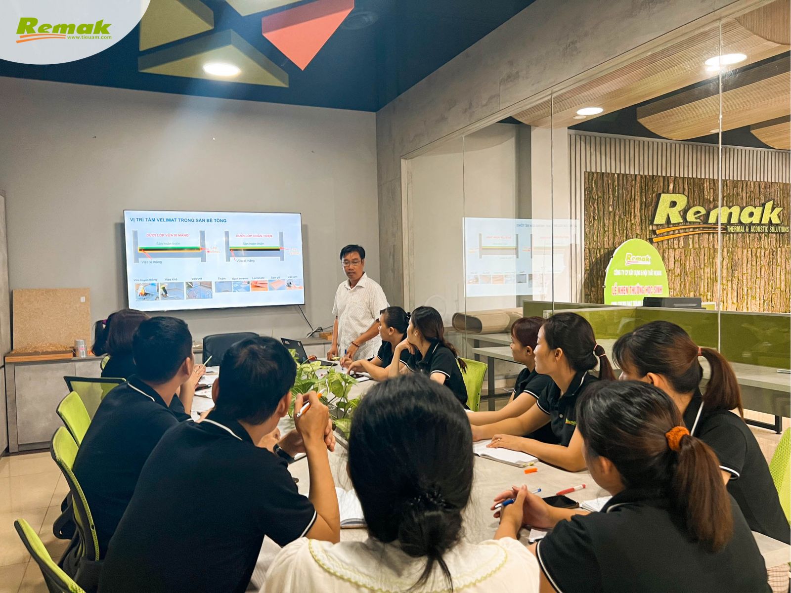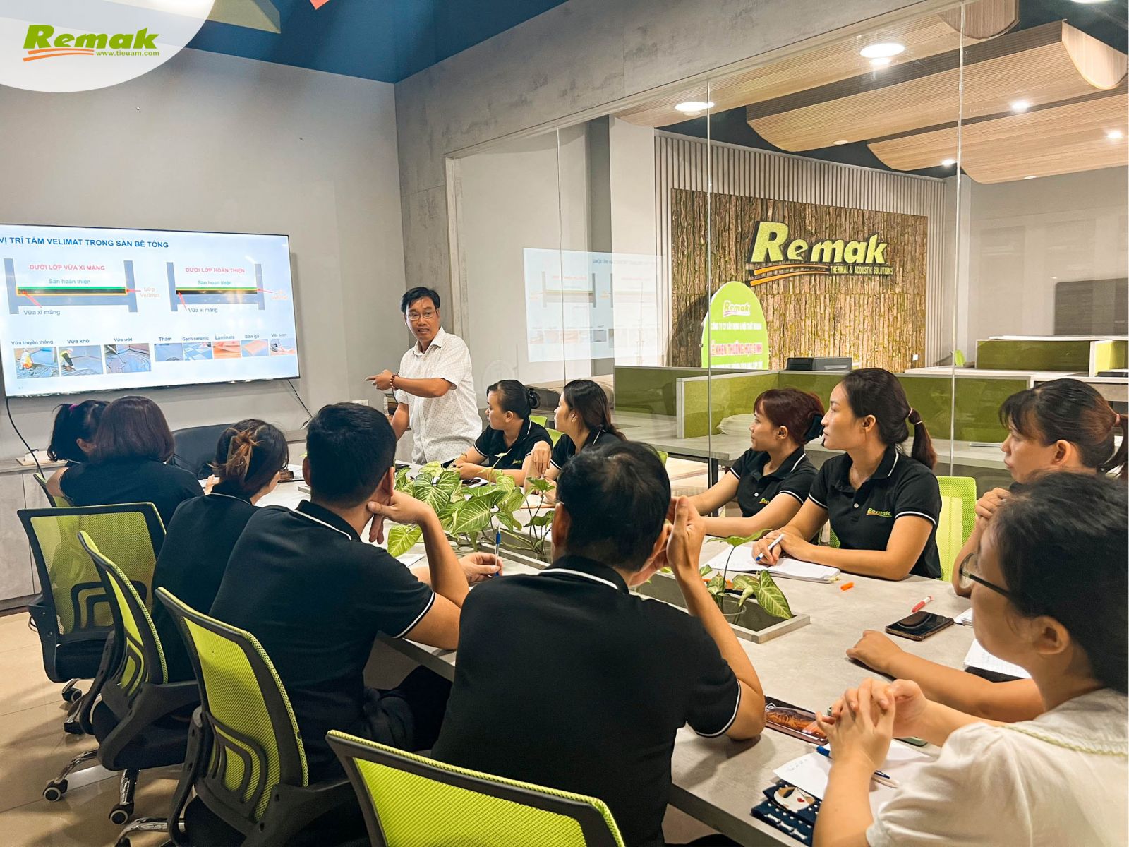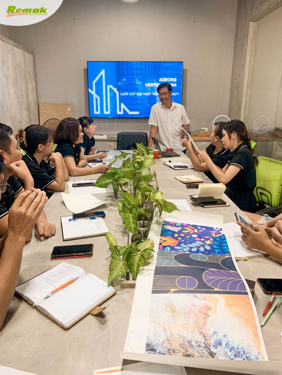 Sáng 18/8, tại văn phòng trụ sở Lại Yên (Hoài Đức, Hà Nội), tập thể nhân viên Remak có buổi học hỏi, giao lưu với ông Huỳnh Nhật An – Trưởng Phòng Kinh doanh ADFORS (thương hiệu trực thuộc Tập đoàn Pháp Saint-Gobain) về 3 dòng sản phẩm: thảm sàn cách âm Velimat®, lưới cốt sợi thủy tinh chống nứt Vertex® Mesh và vải dán tường sợi thủy tinh Novelio® Wallcoverings.