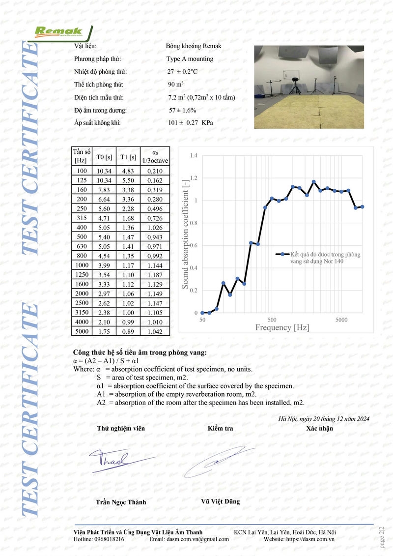 Kết quả thử nghiệm hệ số hấp thụ âm của sản phẩm Bông khoáng cách âm tiêu âm Remak® Rock wool tại Viện DASM