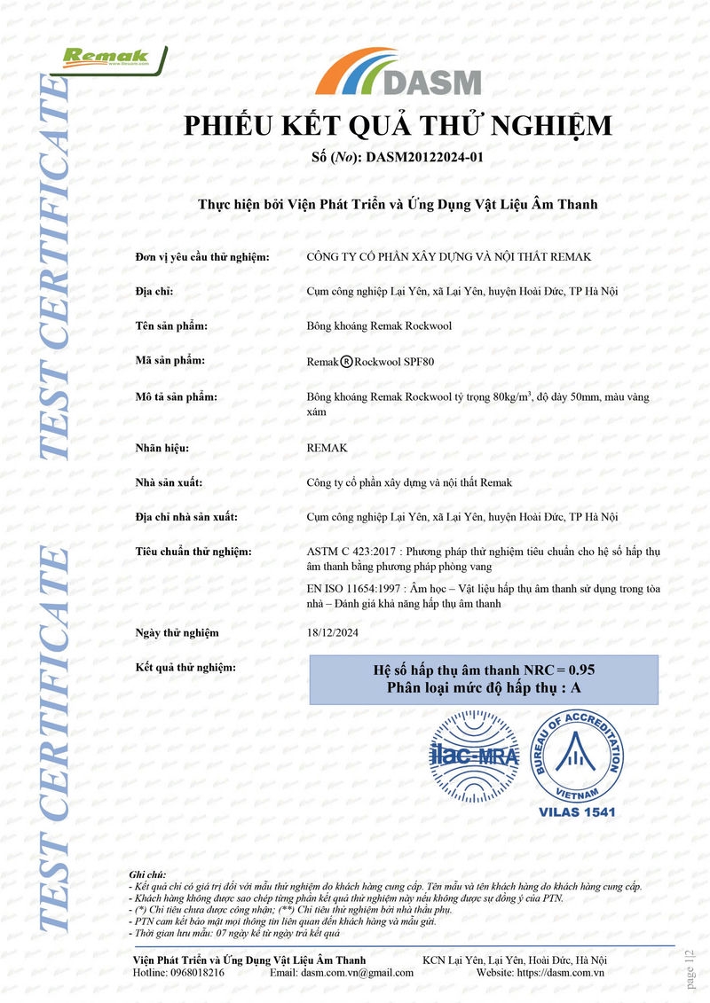 Để khẳng định chất lượng sản phẩm, Remak đã tiến hành thử nghiệm Bông Khoáng Remak® Rockwool tại Viện Phát Triển và Ứng Dụng Vật Liệu Âm Thanh (DASM) – một trong những viện nghiên cứu uy tín tại Việt Nam về vật liệu âm thanh và giải pháp âm học. Và kết quả không làm chúng tôi thất vọng!