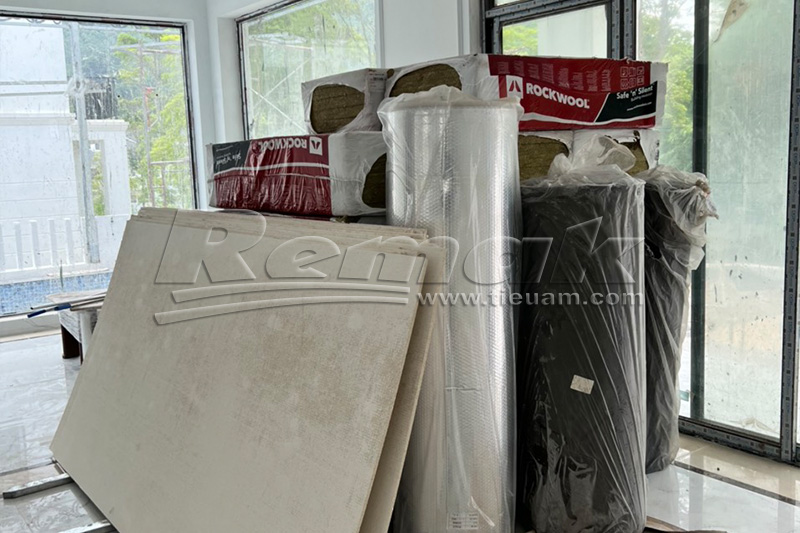 Vì vậy, khách đã đặt từ Remak đơn hàng đồng bộ gồm bông khoáng Rockwool Thái Lan, đinh ghim bông, tấm Remak® MgO, cao su non, túi khí, ống gió mềm D100 ko bảo ôn. Theo đó, vách tiêu âm sẽ chống rung, tiêu âm, tán âm, cách âm, cách nhiệt hiệu quả; giải quyết được bài toán về việc chống ẩm, thông gió – làm thoáng khí ở tầng hầm và phục vụ nhu cầu thưởng thức âm nhạc – thư giãn một cách sáng tạo, hiệu quả.