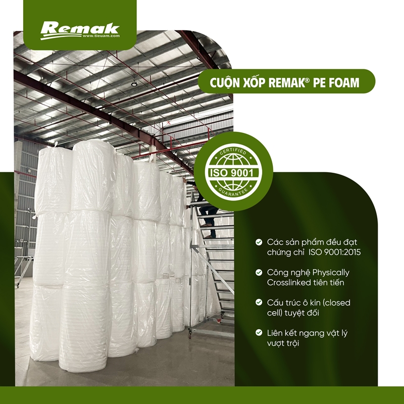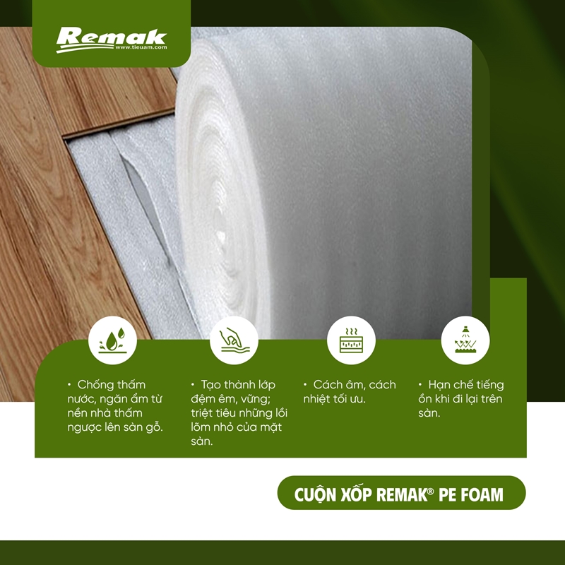Cuộn xốp Remak® PE Foam loại thường màu trắng, loại tráng nilon HDPE, loại tráng bạc OPP kích thước 2mm x 1m x 150m và 3mm x 1m x 100m là vật liệu quan trọng không thể thiếu khi thi công lót sàn gỗ. Đặc biệt, tất cả các sản phẩm của Remak đều đạt chứng chỉ ISO 9001:2015 và được tối ưu hóa để chuyên dụng cho các loại công trình từ phổ thông đến cao cấp.