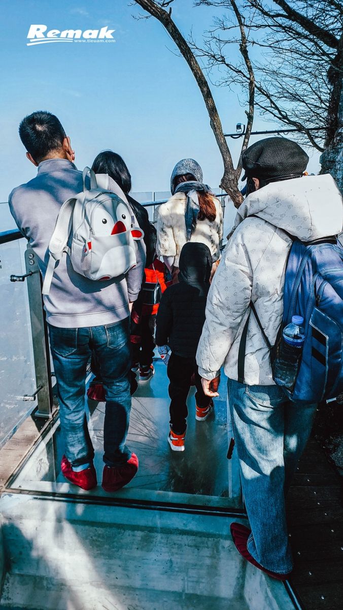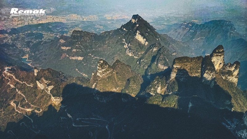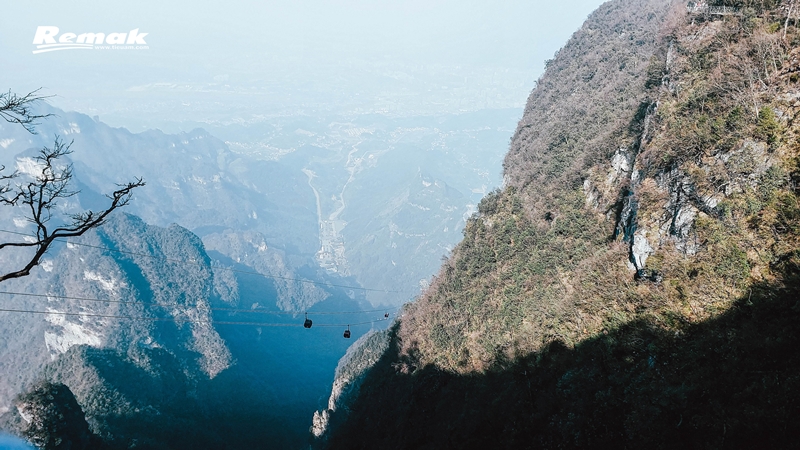 Trong khi đó, với chiều dài 11km cùng 99 khúc cua hiểm trở, Thiên Môn Sơn (nằm ở vườn quốc gia Thiên Môn – Trương Gia Giới) – Top ngọn núi nổi tiếng nhất xứ Trung được mệnh danh là một trong những cung đường nguy hiểm và khó chinh phục bậc nhất. Đoàn Remak đã có một buổi chiều đáng nhớ khi di chuyển bằng cáp treo gồm tất cả 98 cabin có tổng chiều dài 7.455m để đặt chân lên "cổng trời". Nhiệt độ giảm trung bình 10°C so với TP. Trương Gia Giới và bồng bềnh mây phủ. Con đường trong suốt Skywalk được làm từ kính cường lực, ôm sát vào vách đá dựng đứng, đem lại cảm giác thích thú xen lẫn hồi hộp. Cùng với đó là không khí trong lành, thoáng đãng; sắc trời xanh biếc; khung cảnh hùng vĩ trập trùng của non nước hữu tình... dễ dàng gợi nhớ đến hai câu thơ tuyệt tác của Chủ tịch Hồ Chí Minh: “Cao sơn hữu ý thiên niên bút/ Lưu thủy vô thanh vạn cổ cầm.” (Núi cao có ý như cây bút ngàn năm/ Nước chảy không nghe tiếng nhưng lại là cây đàn muôn thuở).