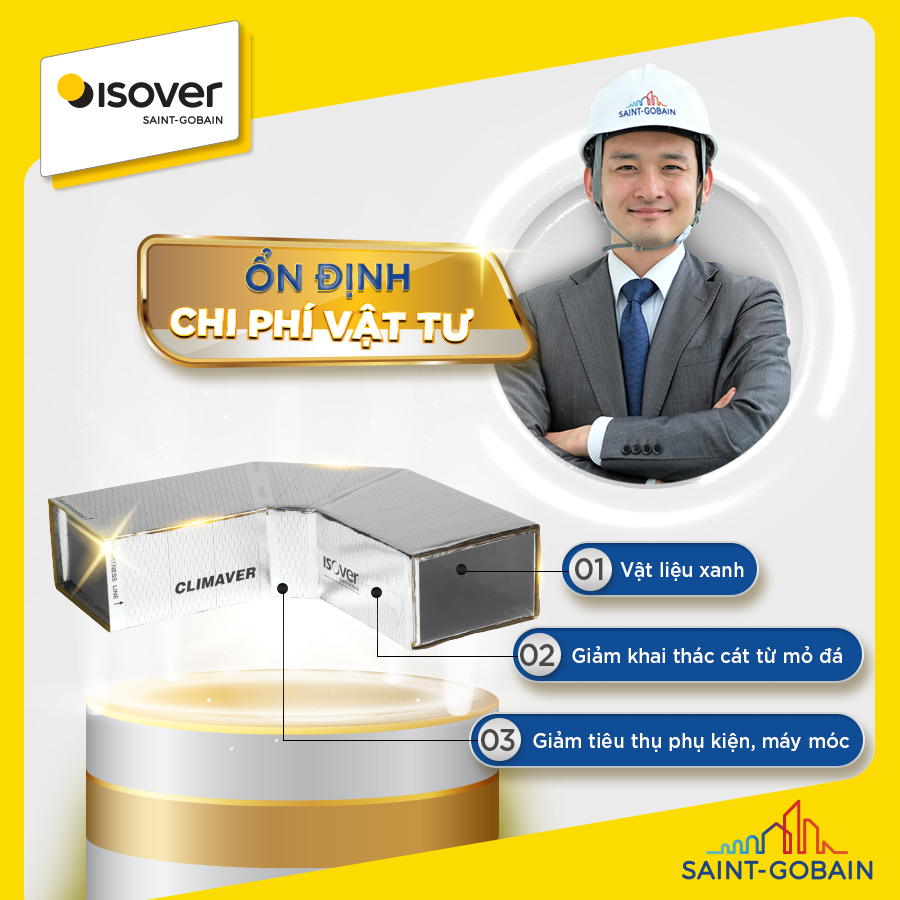 Nguyên liệu đầu vào là 80% là bông thủy tinh tái chế góp phần làm giảm nhu cầu khai thác cát từ mỏ đá, hạ thấp mức tiêu thụ của các phụ kiện và máy móc, đẩy lùi những trăn trở về vấn đề chi phí vật liệu đầu vào do giá vật tư sắt thép biến động hay chi phí phát sinh vận hành hệ thống sau khi dự án hoàn thiện… Qua đó, CLIMAVER® 360 giúp ổn định và đảm bảo chi phí vật tư đầu vào cho công trình.