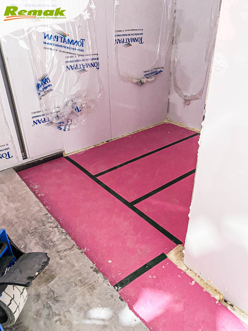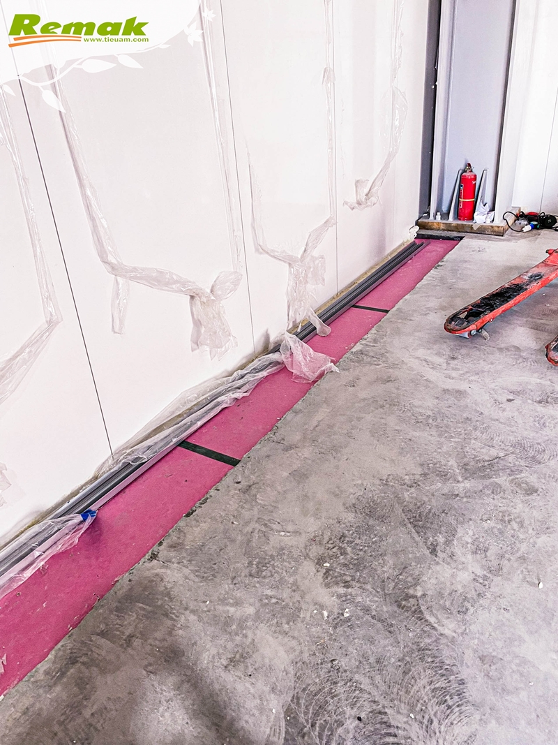 Sàn kho lạnh thường được thi công cách mặt đất khoảng 30-100cm để nâng cao hiệu quả giữ nhiệt. Quy trình đạt chuẩn gồm 8 bước thi công: 1. Nền đất tự nhiên. 2. Lớp bê-tông dày. 3. Lớp chống thấm. 4. Màng nilon. 5. Tấm xốp Remak® XPS. 6. Lưới thép. 7. Lớp bê-tông hoàn thiện. 8. Sơn kháng khuẩn bề mặt.