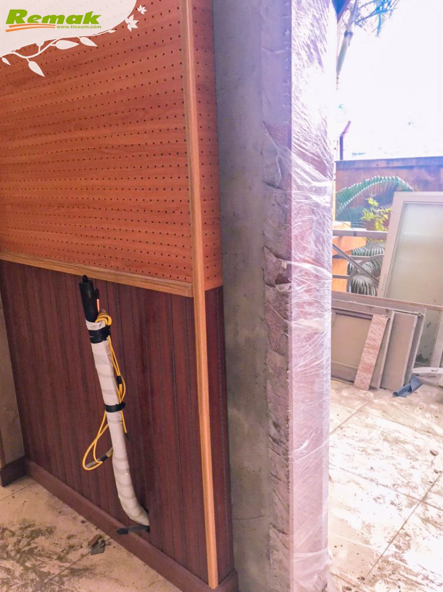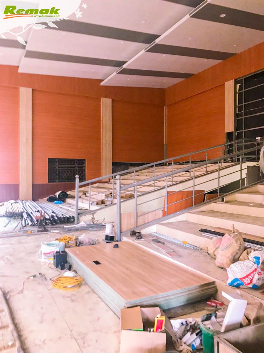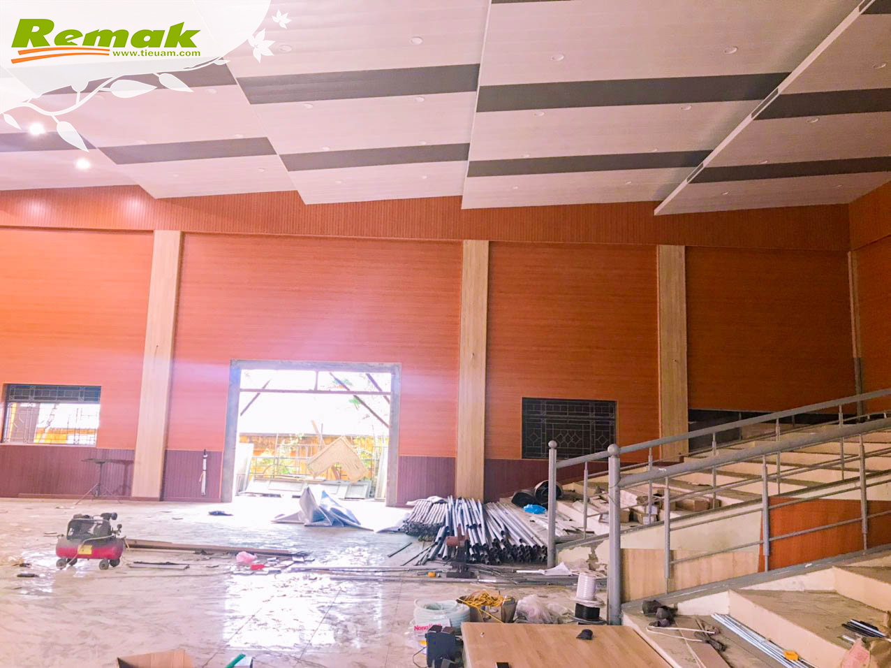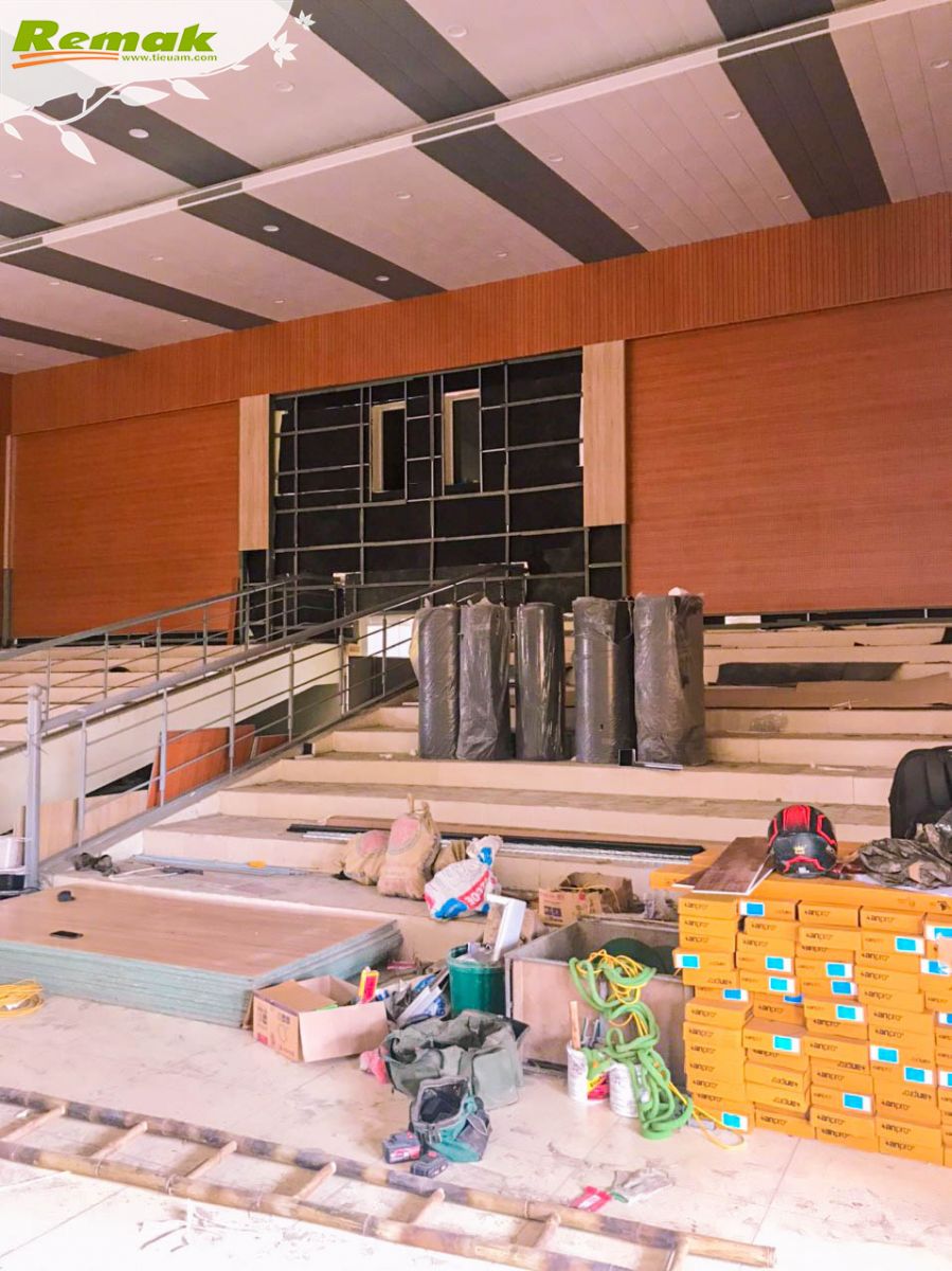 Chùm ảnh dưới đây ghi lại hiện trường hội trường UBND xã Cửu Cao, huyện Văn Giang, tỉnh Hưng Yên sử dụng gỗ tiêu âm đục lỗ Remak® Perforated, gỗ tiêu âm soi rãnh Remak® Linear và cao su non Remak® Sound OFF Damping Rubber để thi công tiêu âm vào cuối tháng 4/2023.