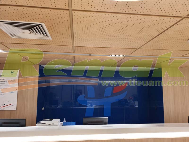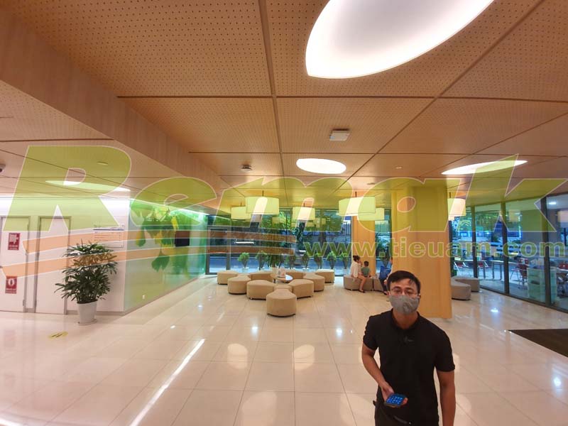 Sau khi khảo sát tình hình thực tế, các kỹ sư, kiến trúc sư của Remak đã lên phương án thiết kế lại trần nhà, sử dụng gỗ tiêu âm đục lỗ trang trí, vừa mang lại không gian ấm cúng, nhẹ nhàng cho bệnh viện vừa tạo ra hiệu suất âm thanh tuyệt vời, giảm tiếng ồn , tiếng vang vọng khó chịu, giúp bệnh nhân và người nhà thoải mái hơn khi sử dụng các dịch vụ tại đây.