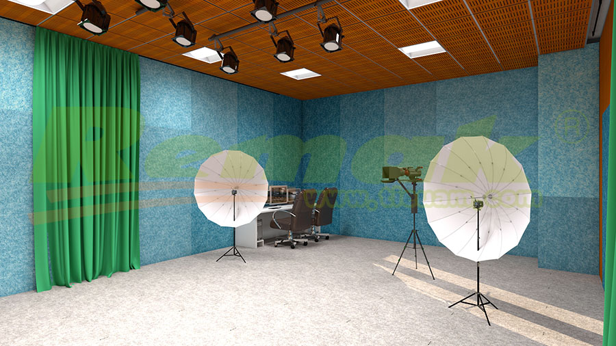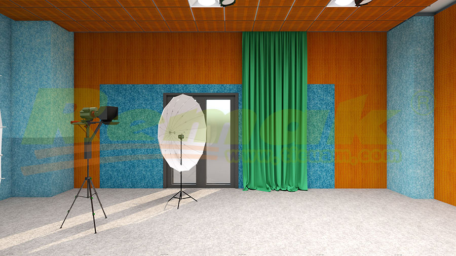 - Trần: Do đặc thù trần có nhiều đường ống, thiết bị chiếu sáng, đèn Led quay phim chiếu sáng, ray treo đèn chạy nên việc xử lý tiêu âm thông thường lên trần không đạt hiệu quả về mặt thẩm mỹ. Chúng tôi đưa ra 2 giải pháp. Do tăng cường diện tích tiêu âm bề mặt nên phần trần có thể không cần thiết phải xử lý tiêu âm phức tạp. Phương án đầu tiên là trần bê tông để thô sơn đen để tránh hắt sáng. Giải pháp thứ 2 là làm một hệ trần cách âm hoàn toàn độc lập phía trên toàn bộ thiết bị như đường ống thông gió, thiết bị PCCC, đèn, ray treo đèn, điện v.v..