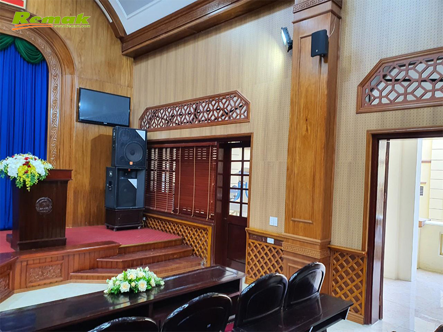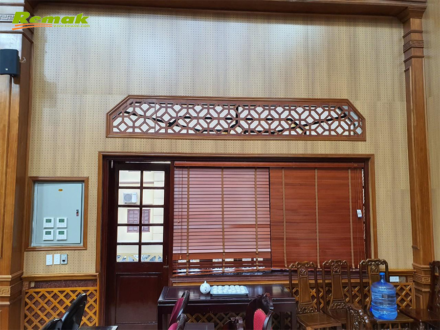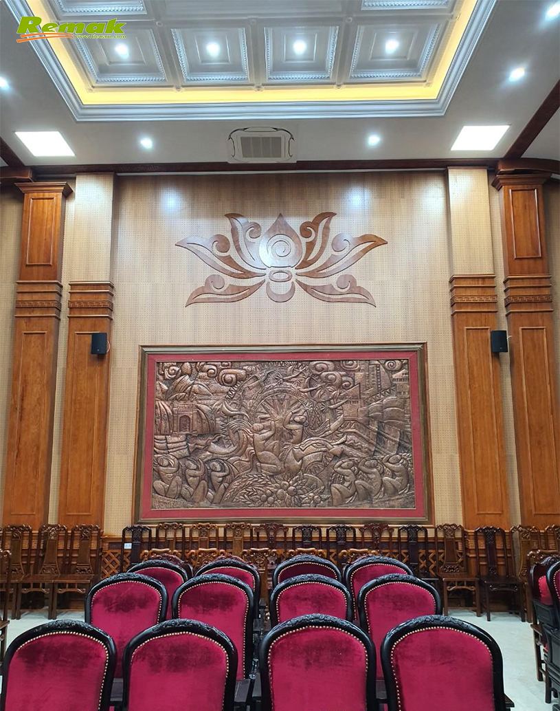 Hội trường UBNN Huyện Hà Nam với diện tích vừa phải được thiết kế nhã nhặn và sang trọng, với sự kết hợp của Gỗ tiêu âm đục lỗ Remak® nhằm mục đích tiêu âm và trang âm trong không gian hội trường.