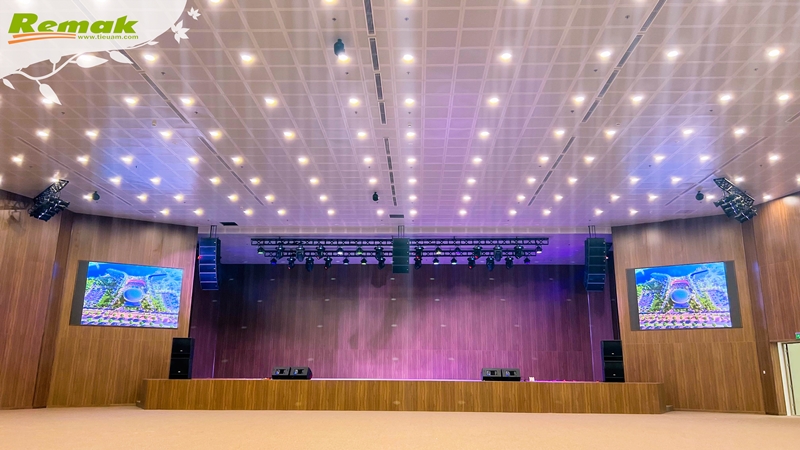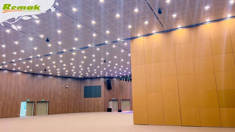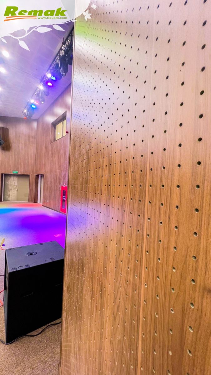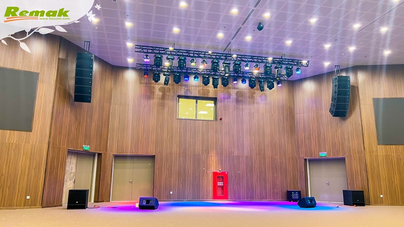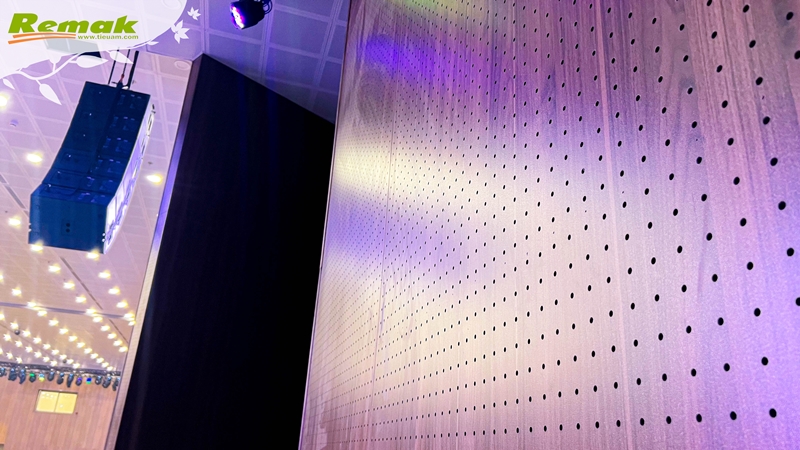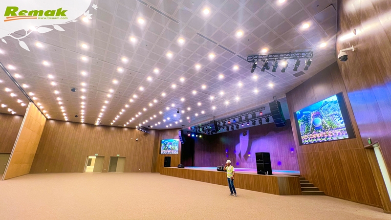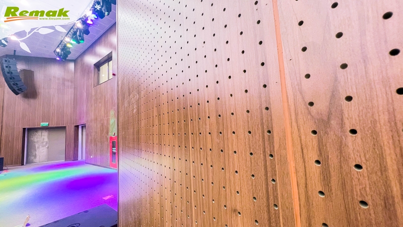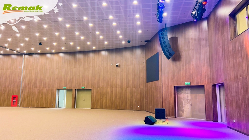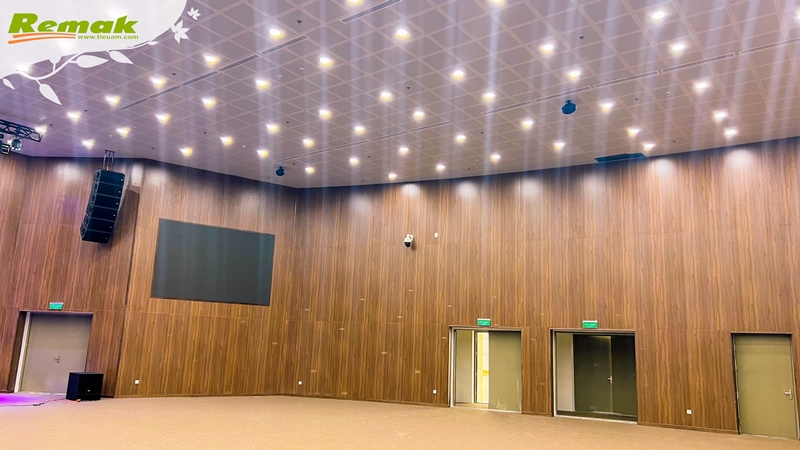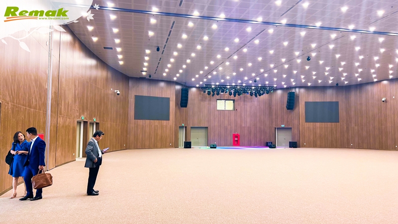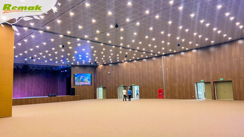 Một số hình ảnh về hạng mục khối nhà Trung tâm Hội nghị quốc tế do Remak thi công tiêu âm bằng bông khoáng Remak® Rockwool và gỗ tiêu âm đục lỗ Remak® Perforated: