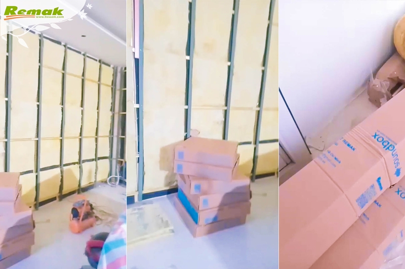 Nhà thầu đã thi công bằng kỹ thuật kết hợp khung xương sắt hộp với gỗ, giữa những khoảng trống chèn bông thủy tinh Remak® Glasswool 1 mặt bạc có đặc tính tiêu âm, cách âm, cách nhiệt, chống ẩm, chống cháy hiệu quả. Bề mặt được hoàn thiện bằng gỗ tiêu âm đục lỗ Remak® Perforated đan xen gỗ tiêu âm soi rãnh Remak® Linear vừa tạo nên phong cách trang nhã, hiện đại vừa đạt hiệu suất vượt trội về mặt âm học. Chúng giúp thanh lọc tạp âm, tiếng ồn hay âm dội tối ưu; tạo ra sự tĩnh lặng, sâu lắng cho không gian; đặc biệt cần thiết với các khu vực có đòi hỏi khắt khe về kỹ thuật âm thanh.
